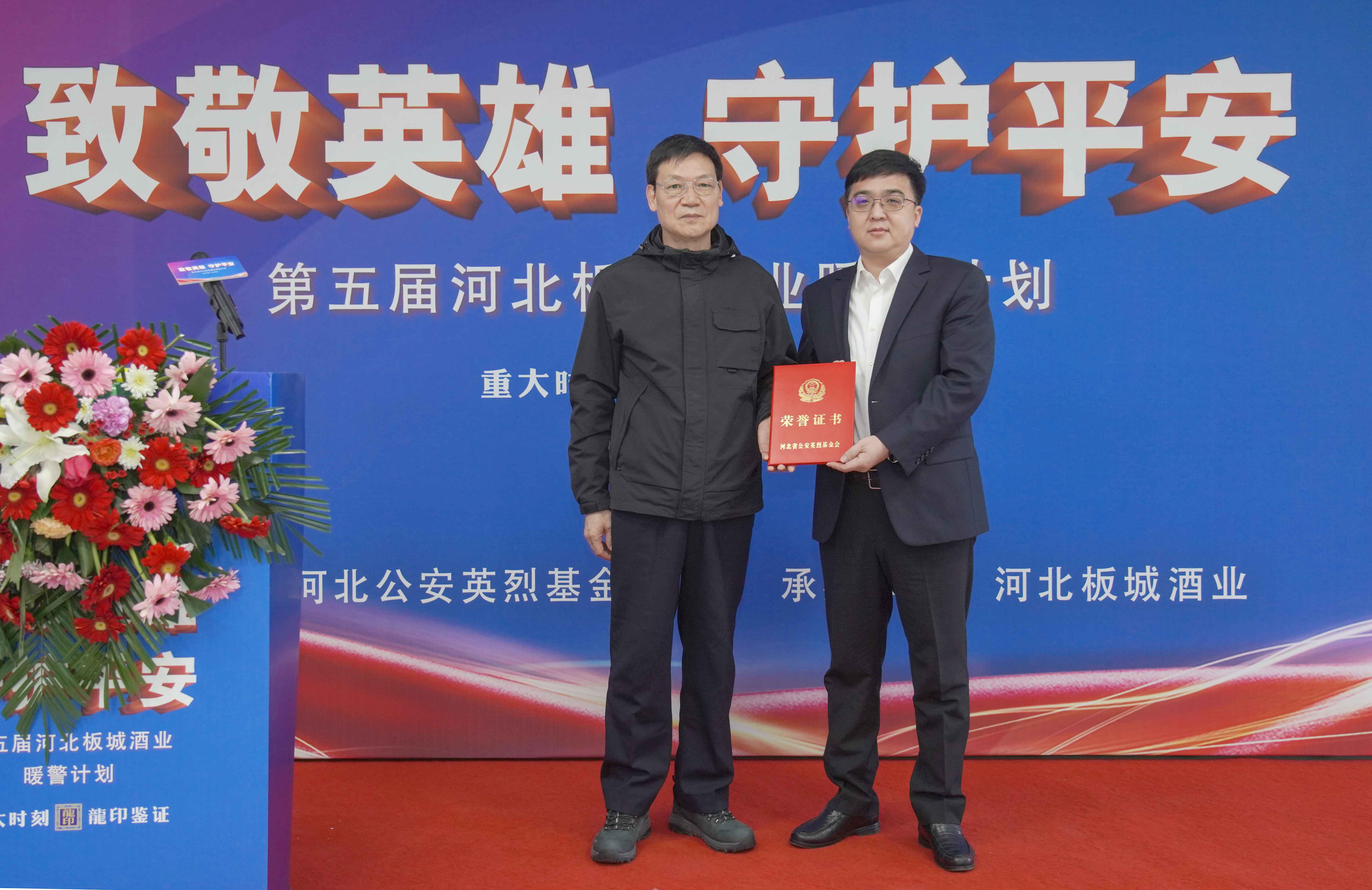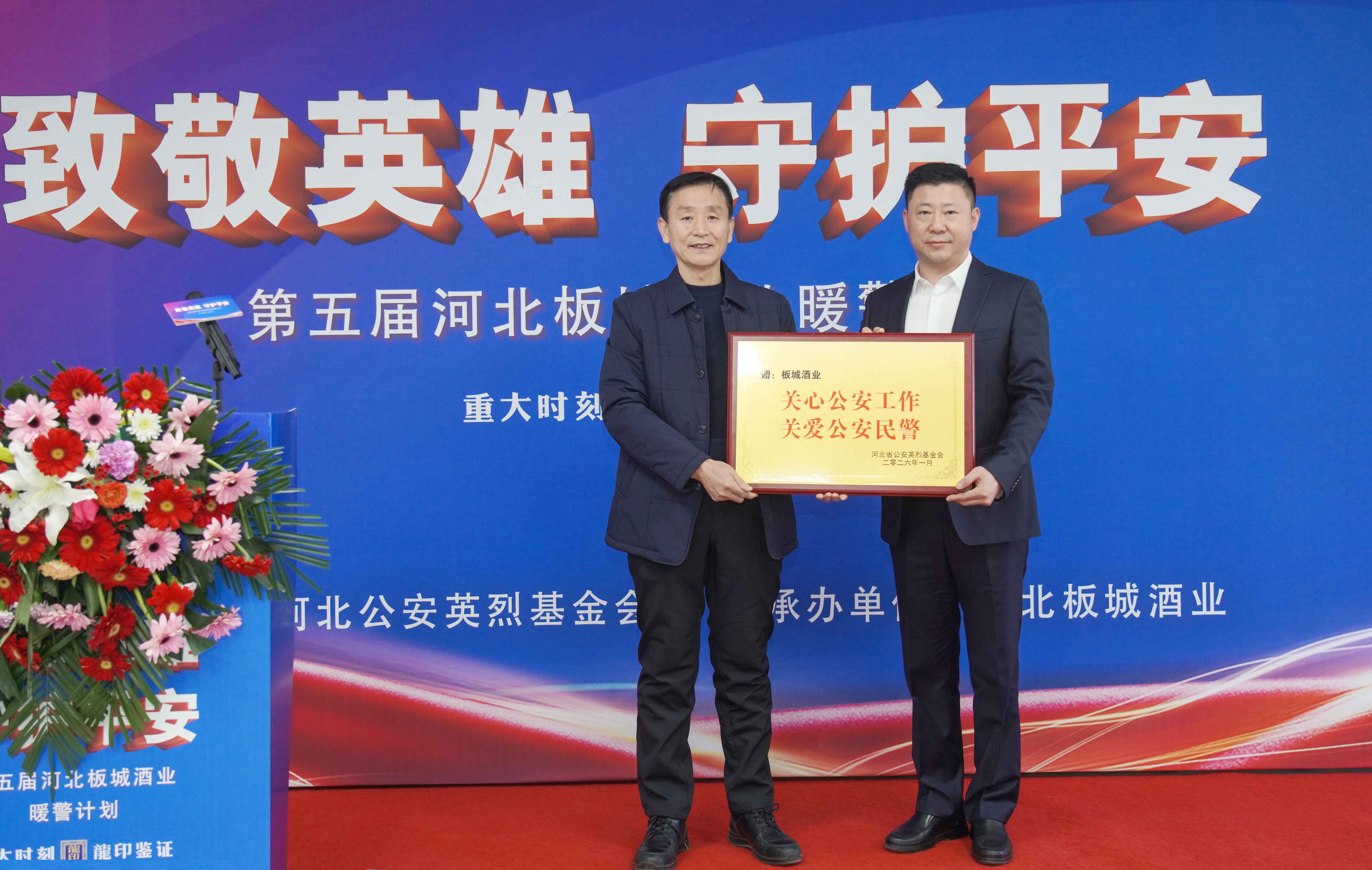河北省公安英烈基金会副理事长崔际尚向和记娱酒业授予爱心企业牌匾。